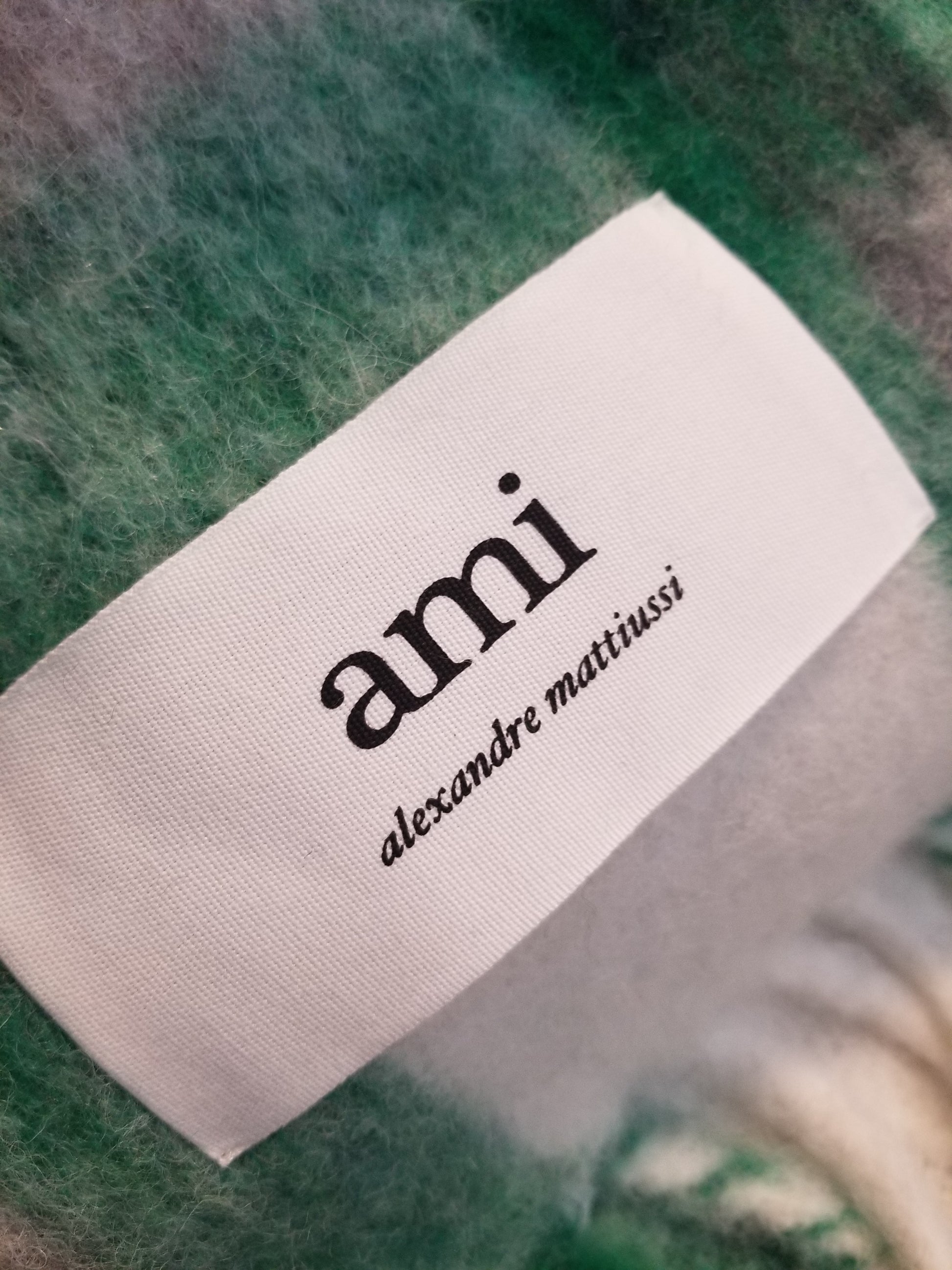 - Design Features: Oversized silhouette, fringed edges, classic check pattern, subtle AMI logo detail