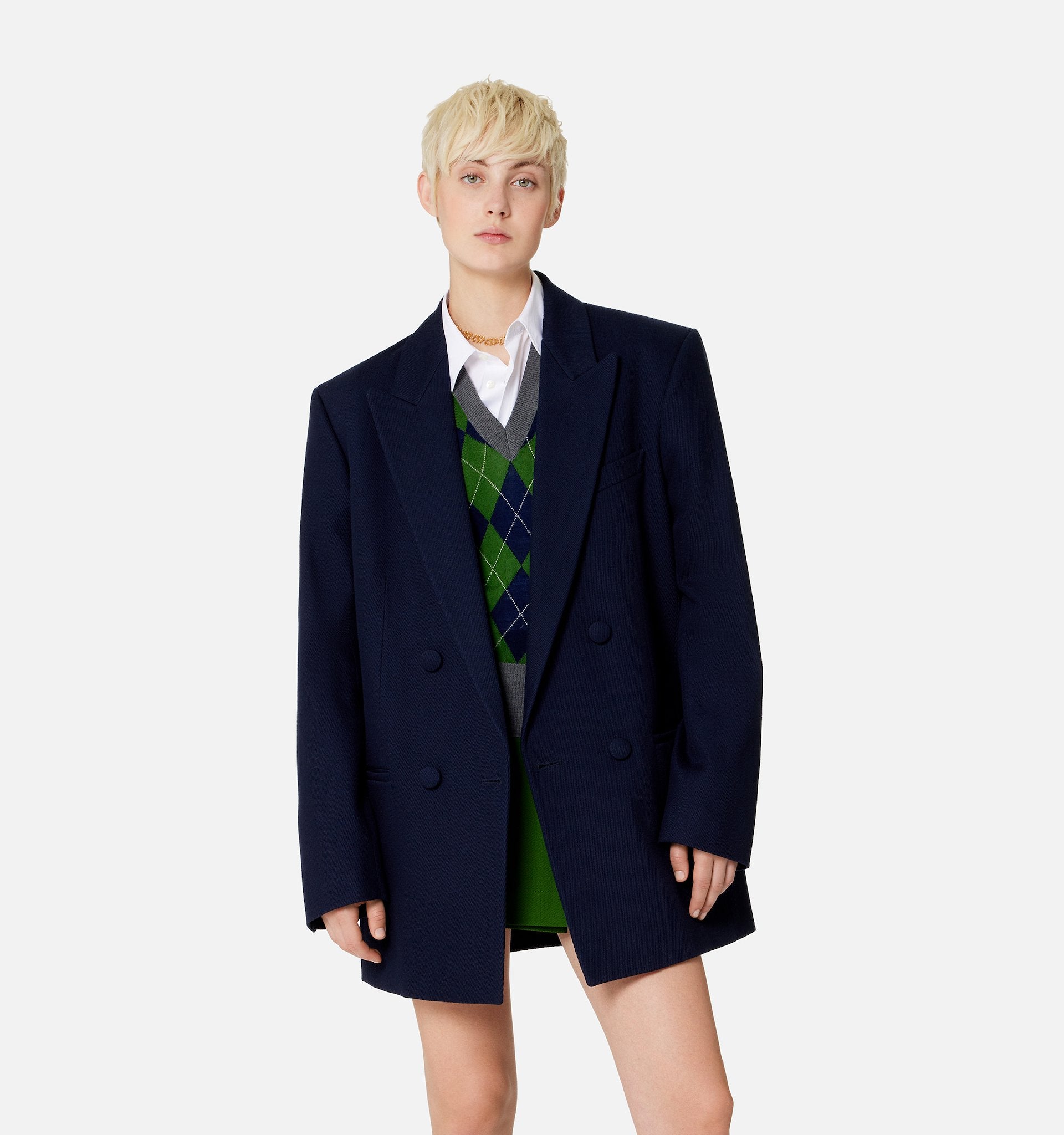 - Elegant argyle intarsia knit pattern across the front panel.