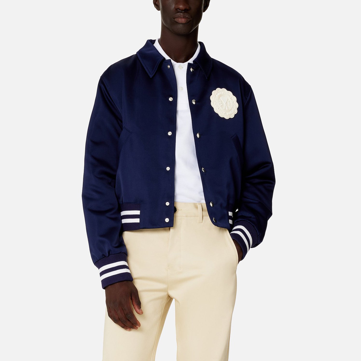 - Type & Color: Varsity bomber jacket available in navy and cream