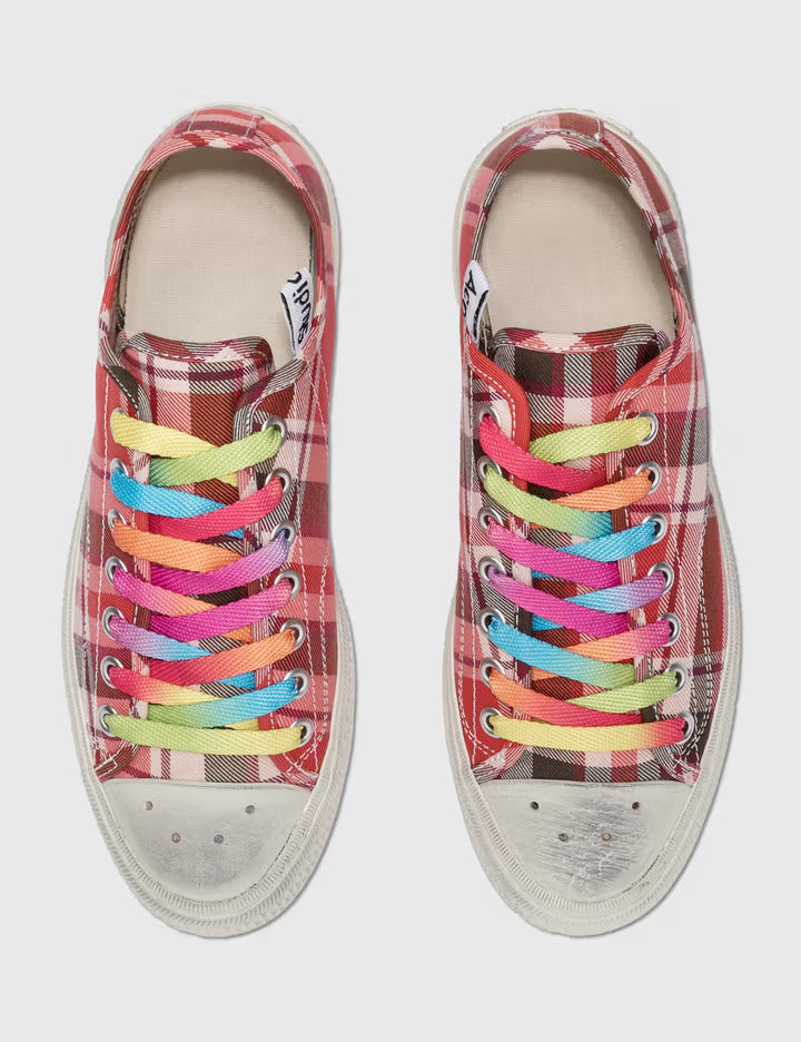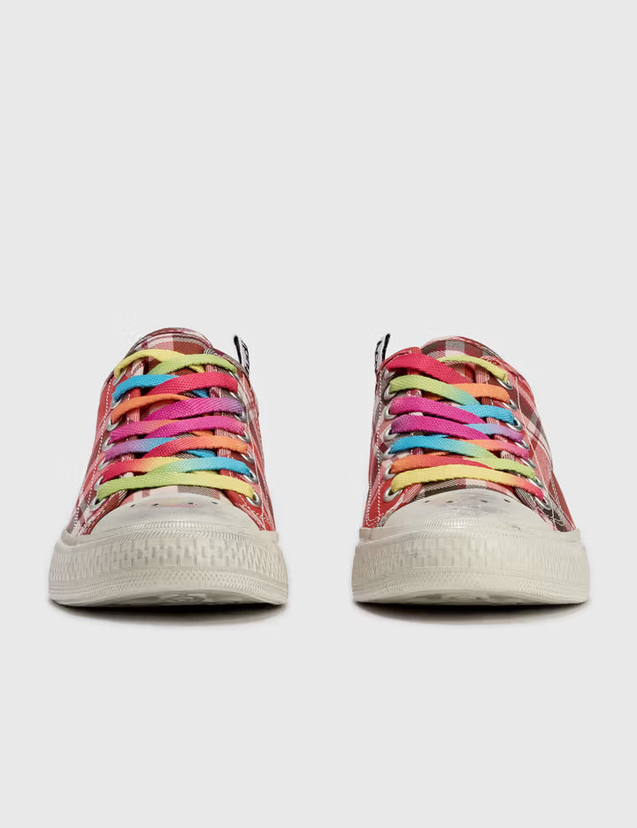Pair with denim, skirts, or casual dresses to highlight the colorful laces and checkered design. Ideal for adding personality and fun to your streetwear look.