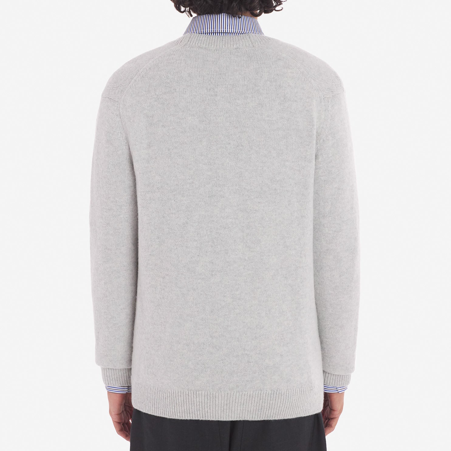 - Type & Color: Classic V-neck wool cardigan in light gray