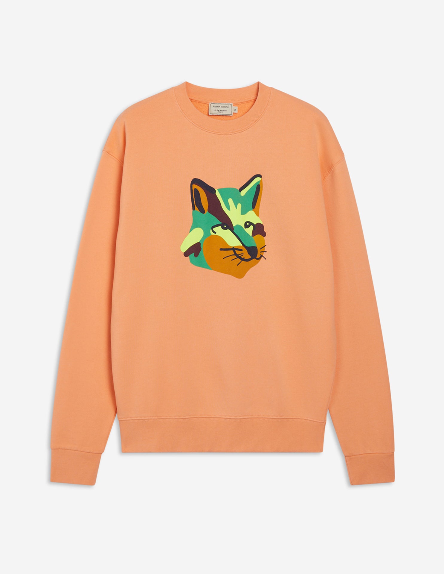 - Type & Color: Crewneck sweatshirt available in grey, black, and coral, featuring a bold multicolor fox head patch
