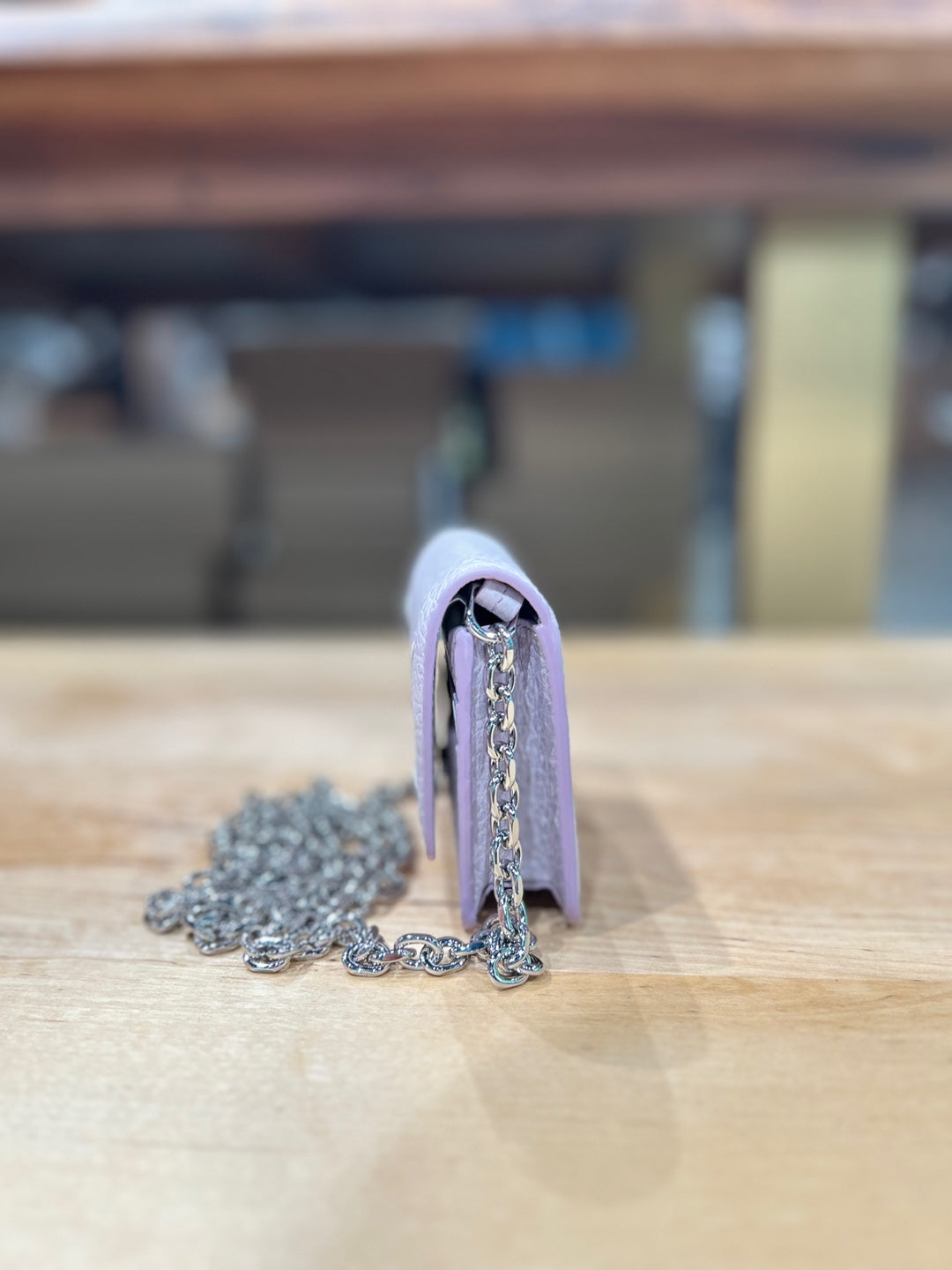 - Tri-fold wallet design featuring a detachable metal chain for versatile carry.