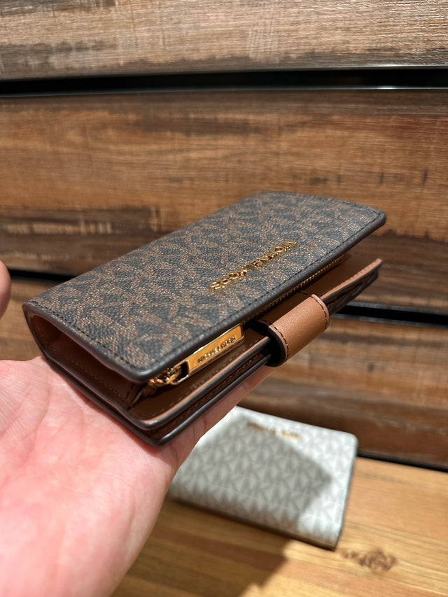 The wallet features a structured bifold design secured with a snap closure, allowing for easy access while keeping essentials safely stored. Smooth trim accents frame the signature canvas, enhancing durability and maintaining shape over time. Subtle gold-tone Michael Kors logo hardware adds a touch of elegance without overwhelming the design.