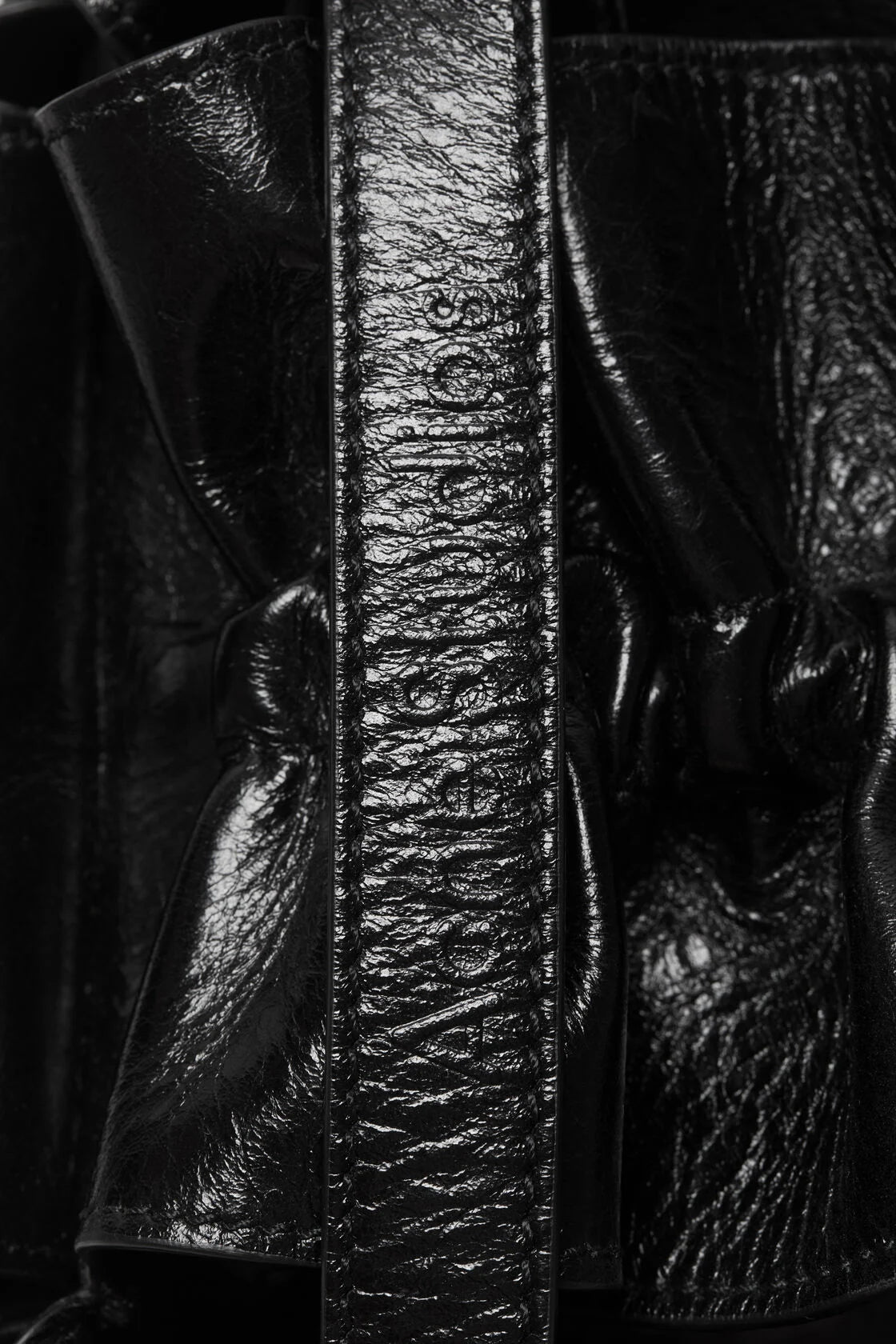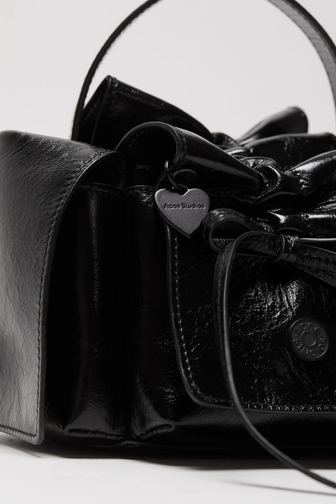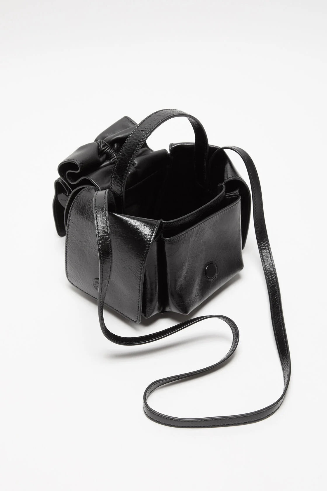 - Type & Color: Compact handbag in glossy black