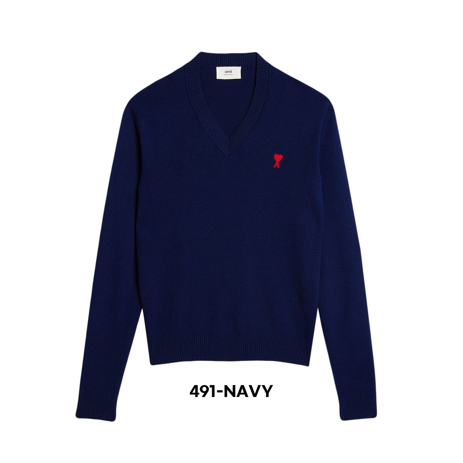 - Design Features: Classic V-neck design, ribbed cuffs and hem, embroidered AMI small red heart logo on the chest